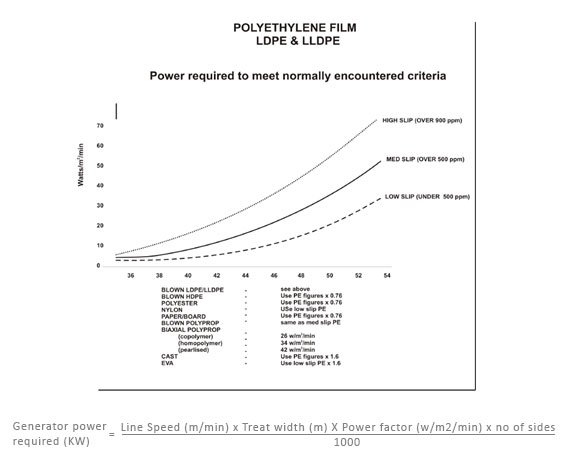 In corona treatment, the film is passed over the roller through the air gap between the fixed electrode and the dielectric whereby the film is exposed to a very high voltage potential at a very high frequency, which causes ionization of air. The equipment used to achieve this comprises a generator, which converts available 230V / 415V, 50Hz power supply a high voltage transformer and the treating station itself.